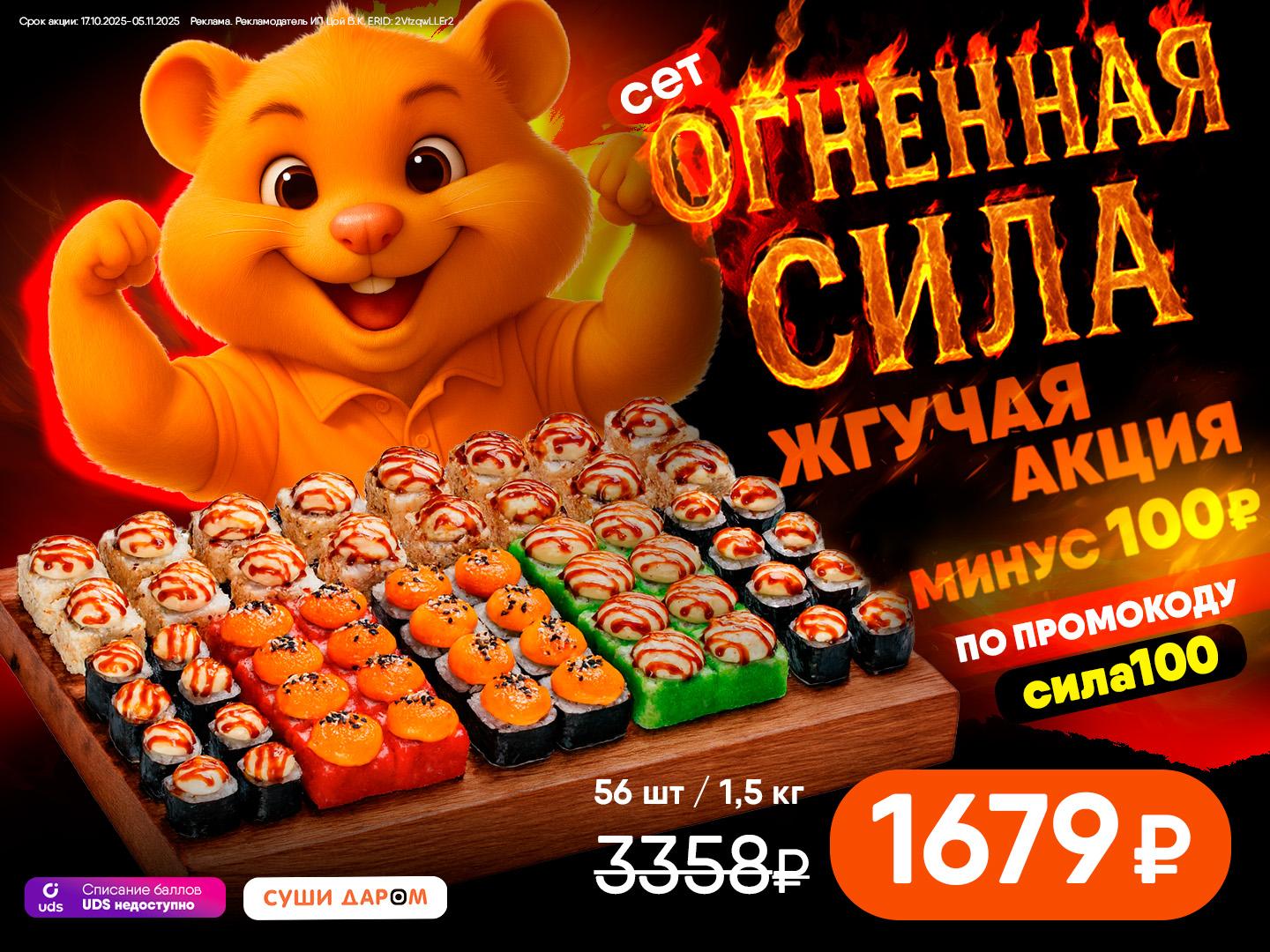 Роллы: Тоямо, Рэд кани. Запечённые: Анион чиз, Дабл чиз. Жареные: Далматин, ЧикенГо, Лава чикен