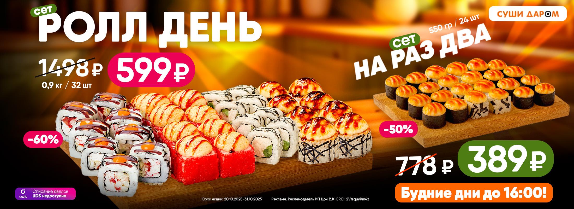 Роллы: Рико, Тоямо. Запечённые: Дабл чиз, Лососевый. Жареные: Кани темпура, Цезарь, Аристокраб, Далматин
