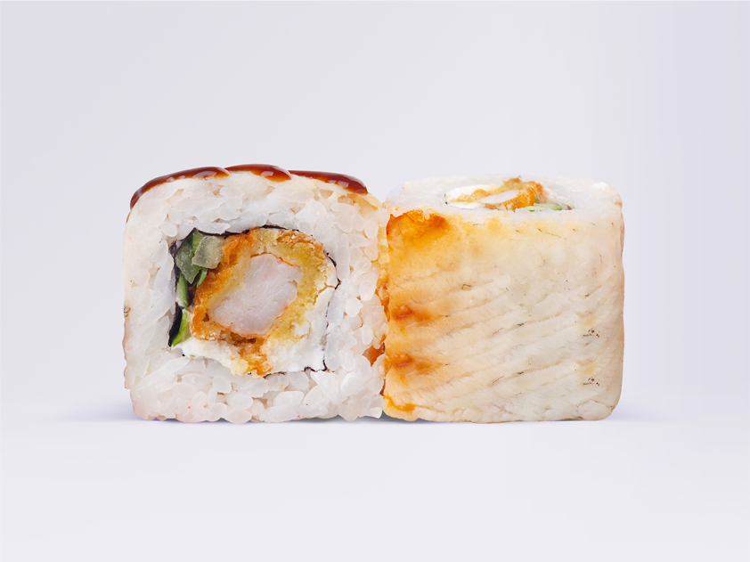 Угорь, креветка темпура, сыр сливочный, соус унаги, кунжут
