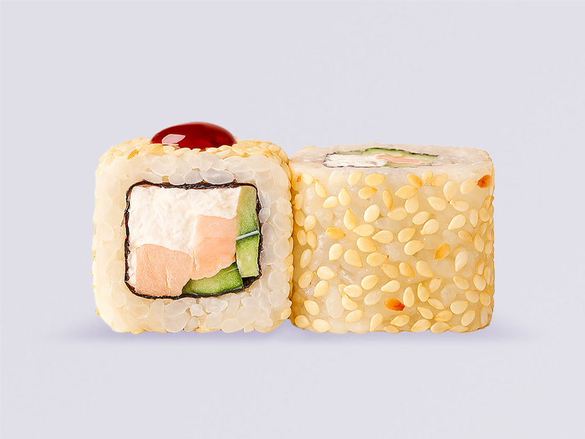 Курица копченая, сыр сливочный, огурец, кунжут, соус унаги