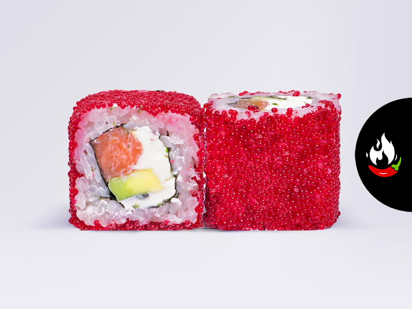 Лосось, сыр сливочный, икра масаго, огурец, соус спайси