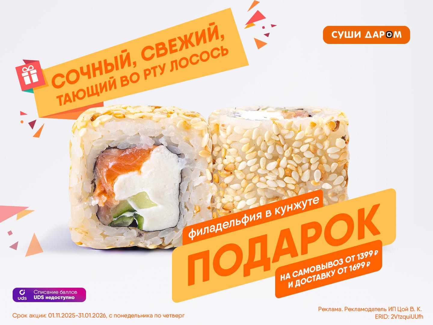 Побалуйте себя нежным вкусом нашего фирменного ролла филадельфия в кунжуте и насладитесь моментом: [emoji=:yellow_heart:]Для любителей самовывоза: подарок при заказе на сумму от 1399 рублей. [emoji=:yellow_heart:]Для ценителей домашнего уюта: подарок при заказе доставки на сумму от 1699 рублей. Сочный, свежий, тающий во рту лосось — идеальное дополнение к вашему дню и повод улыбнуться![emoji=;)] Не упустите шанс! Такой вкусный подарок ждёт именно вас. Срок акции с 01.11.2025-31.01.2026 с понедельника по четверг (включительно) *Подарки не суммируется с другими акциями за самовывоз, т.е. один заказ – один подарок. **Баллы UDS списываются до минимальной пороговой суммы от которой действует подарок (т.е. 1699р, 1399р)