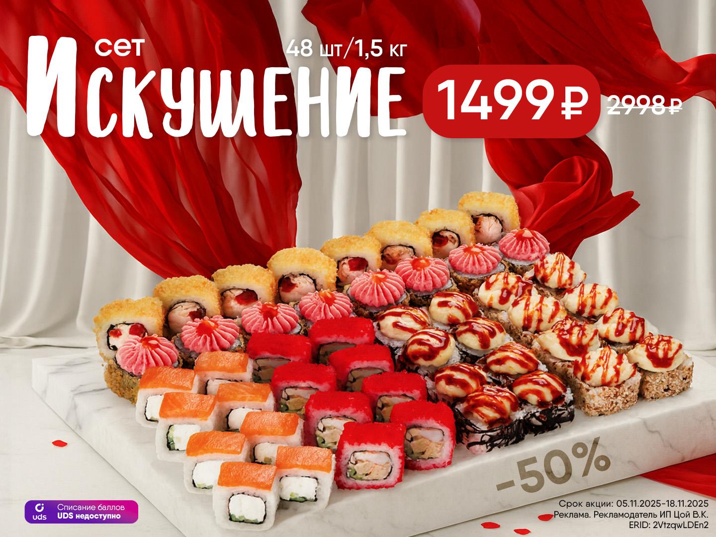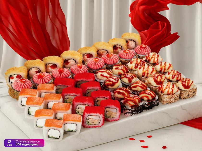 Роллы: Филадельфия лайт, Калифорния с креветкой. Запечённые: Огненный дракон, Дабл чиз. Жареные: Лава чикен, Цезарь